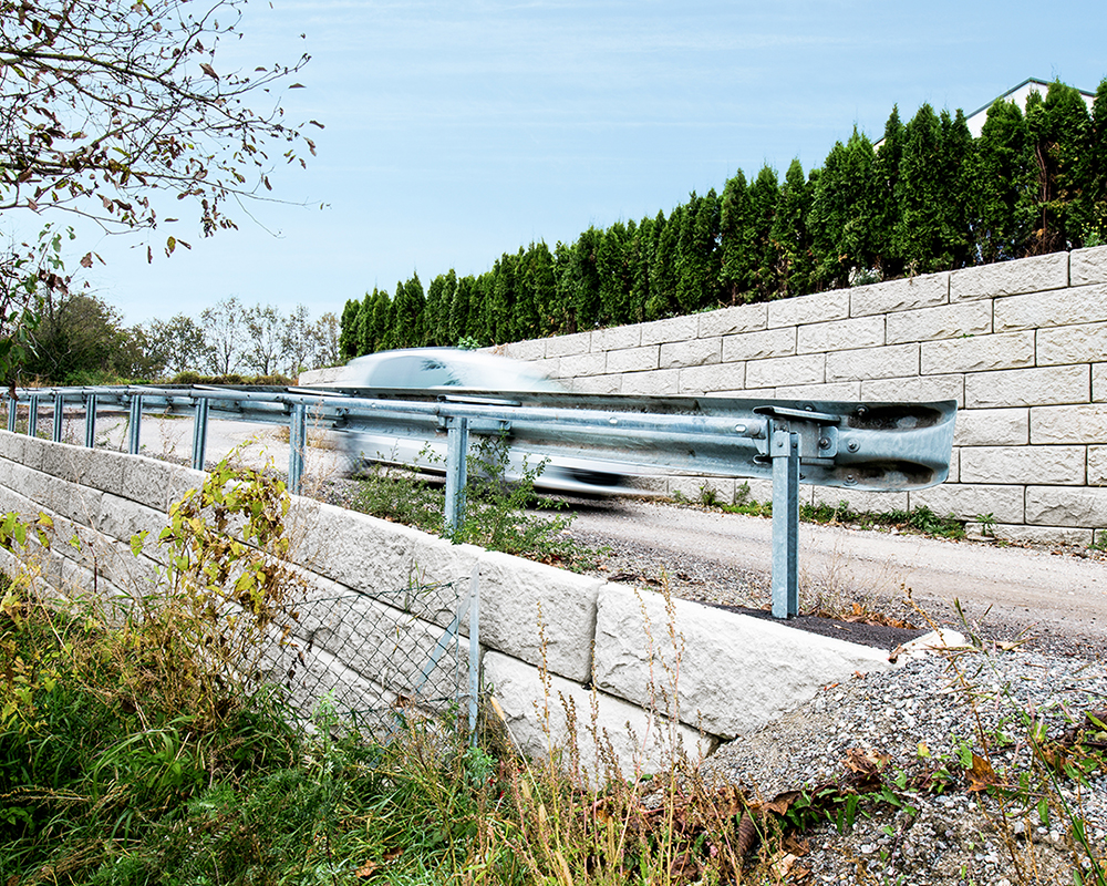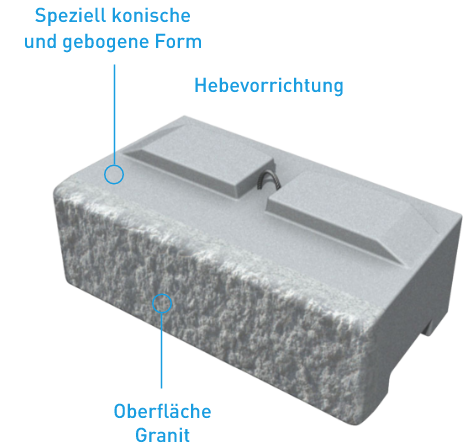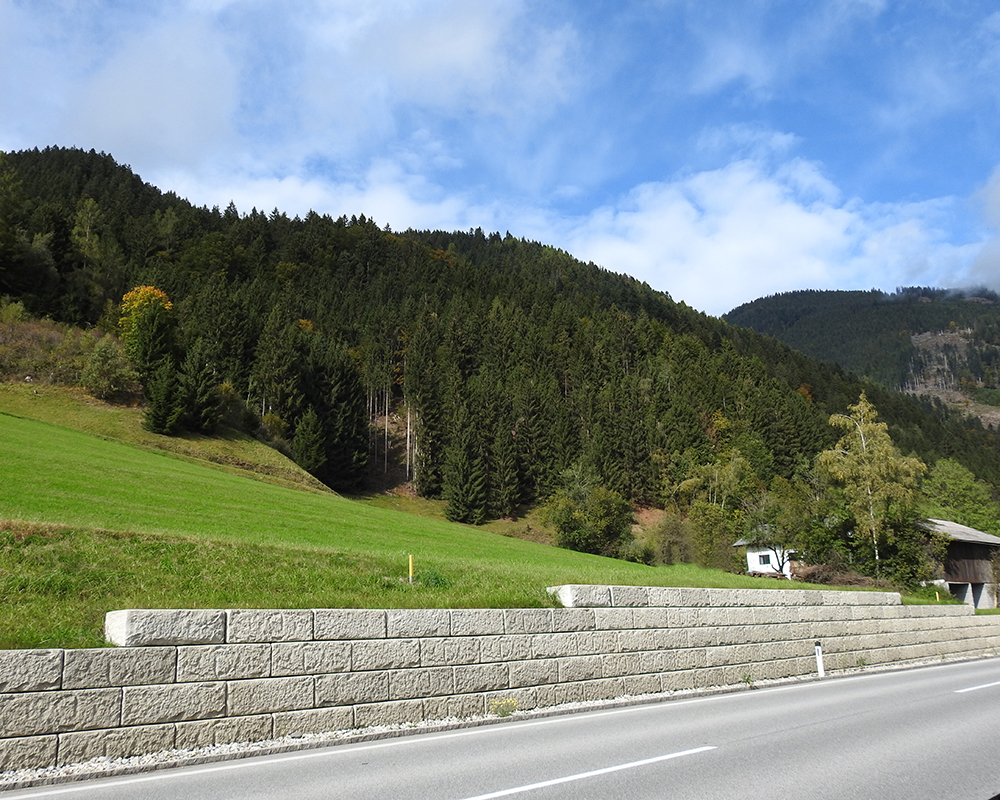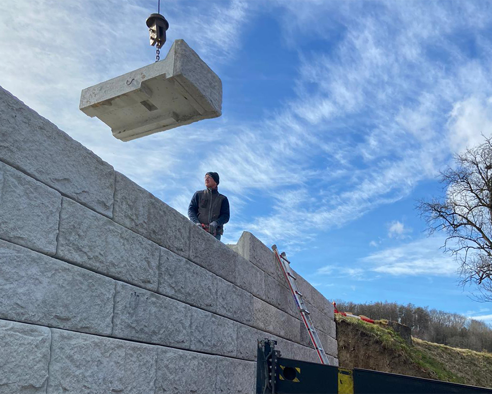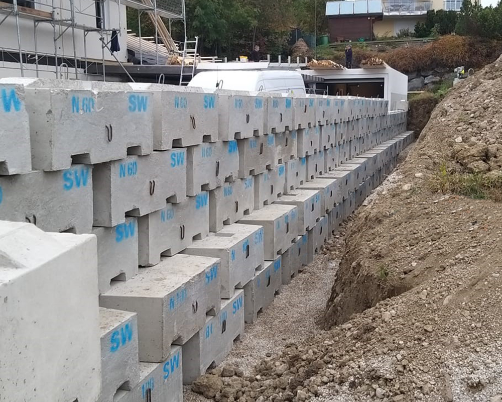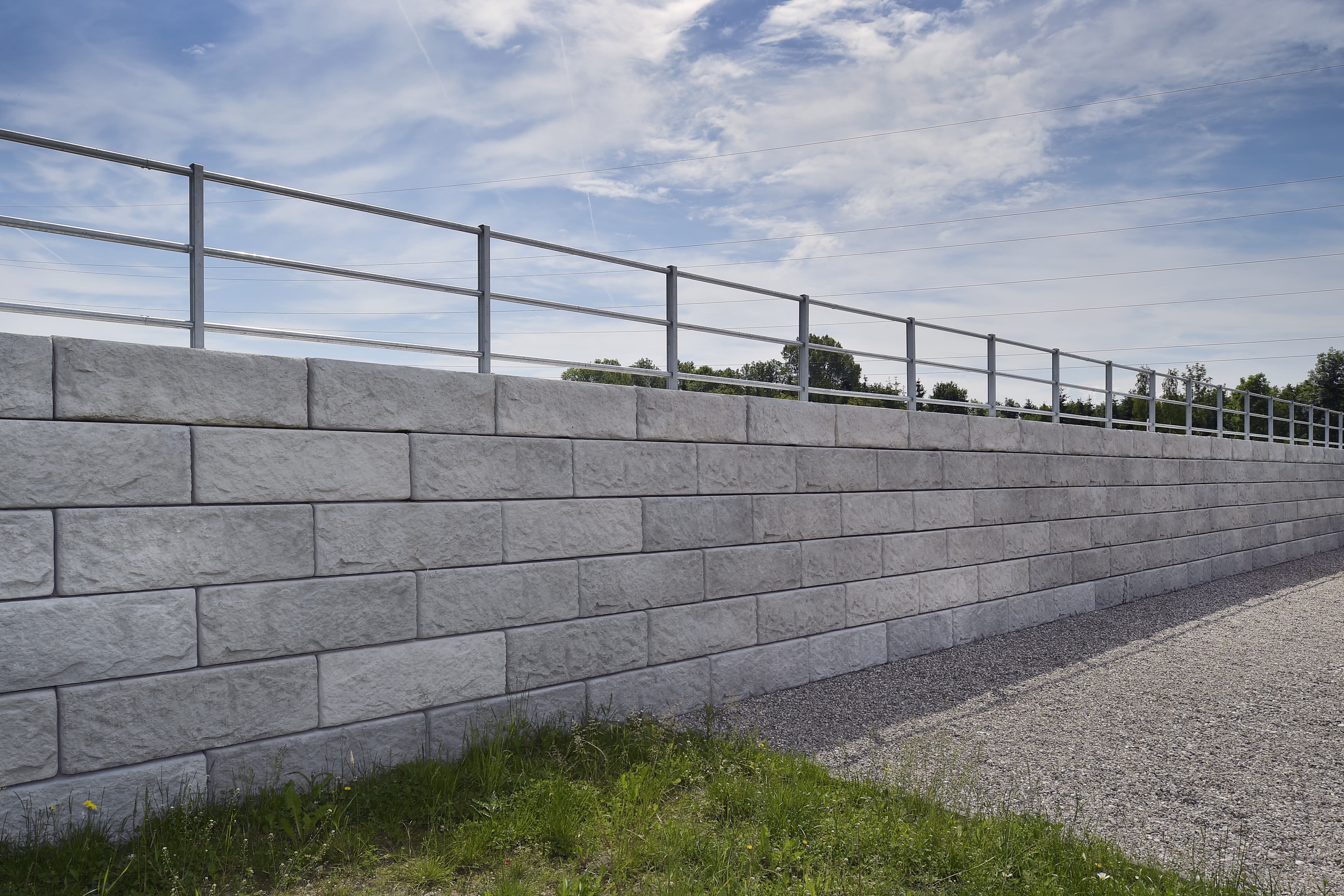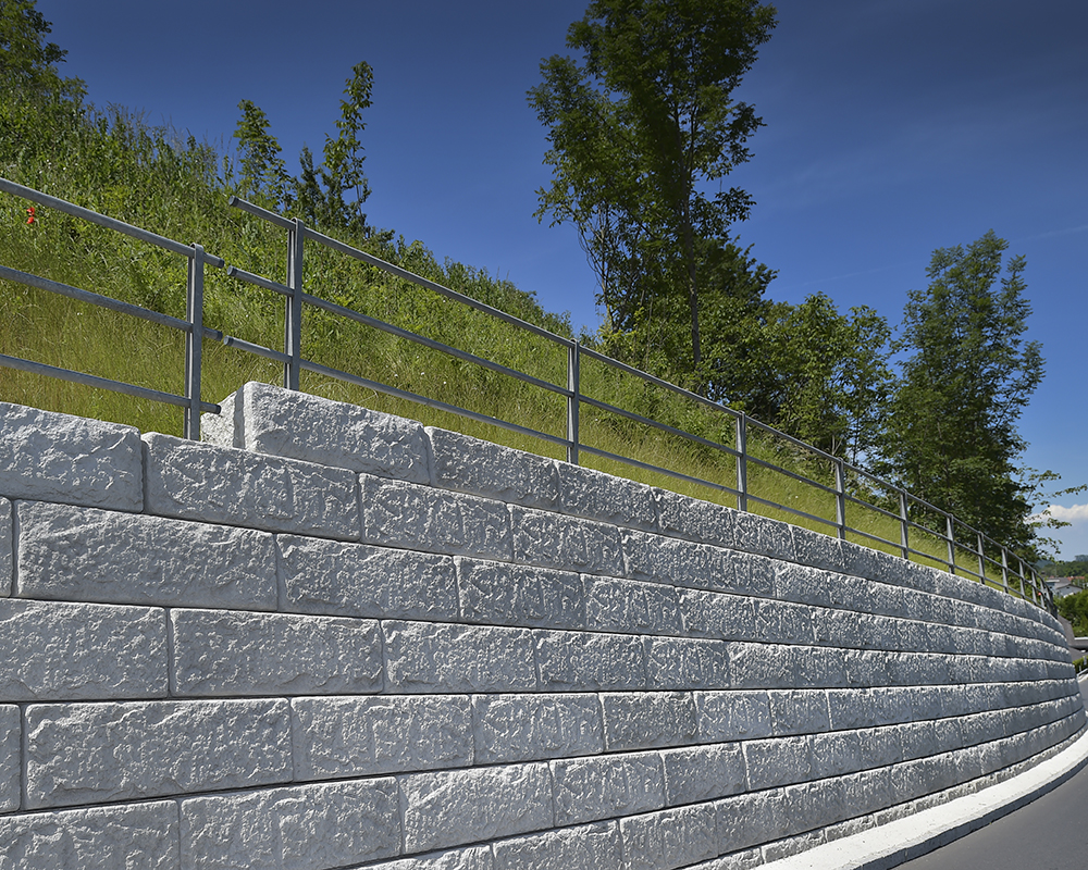 Das SW-Stützwandsystem kann sowohl als klassische Beton-Schwergewichtsmauer mit unterschiedlich tiefen Systemsteinen oder in Kombination mit Geogittern als erdbewehrte Schwergewichtsmauer ausgeführt werden. Unabhängig welche Bauweise Sie wählen – die große Versetzleistung macht das dauerhafte SW-Stützwandsystem ideal für den Infrastrukturbau.