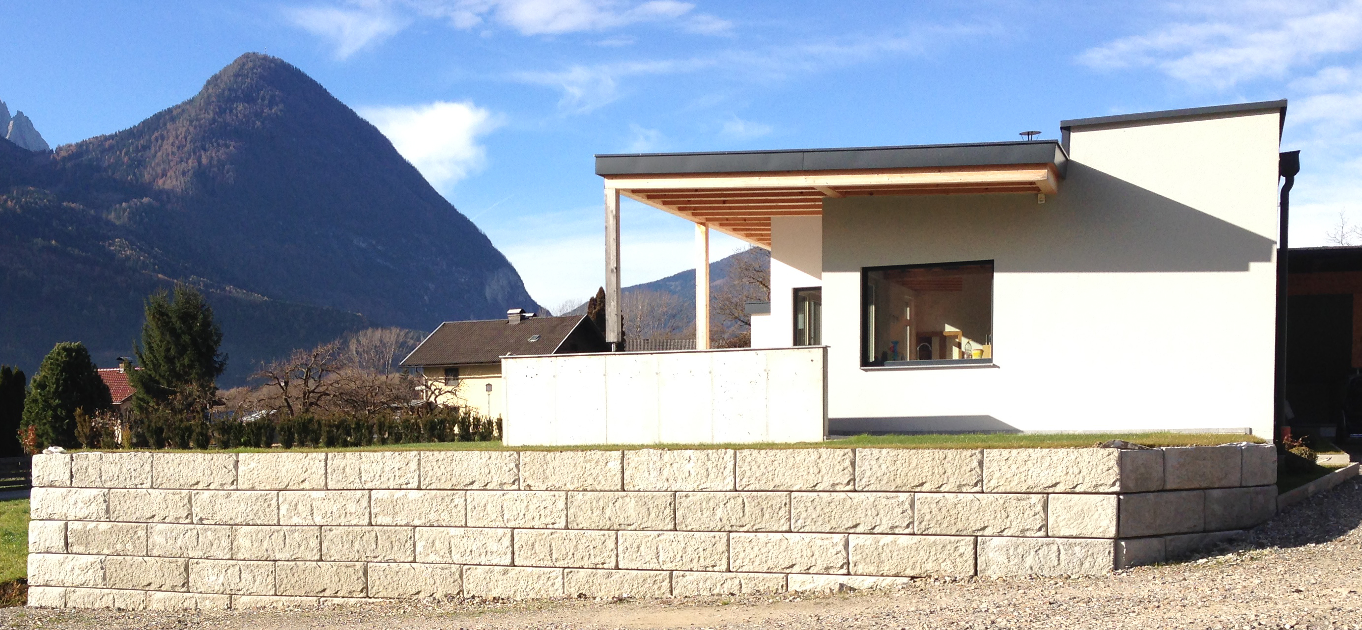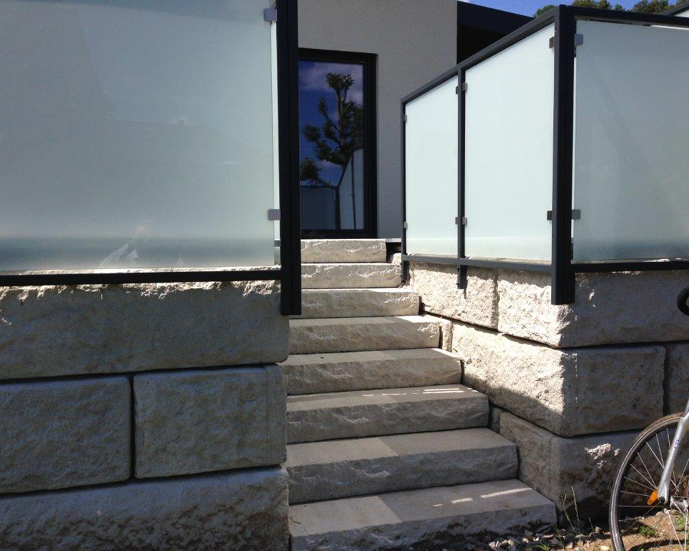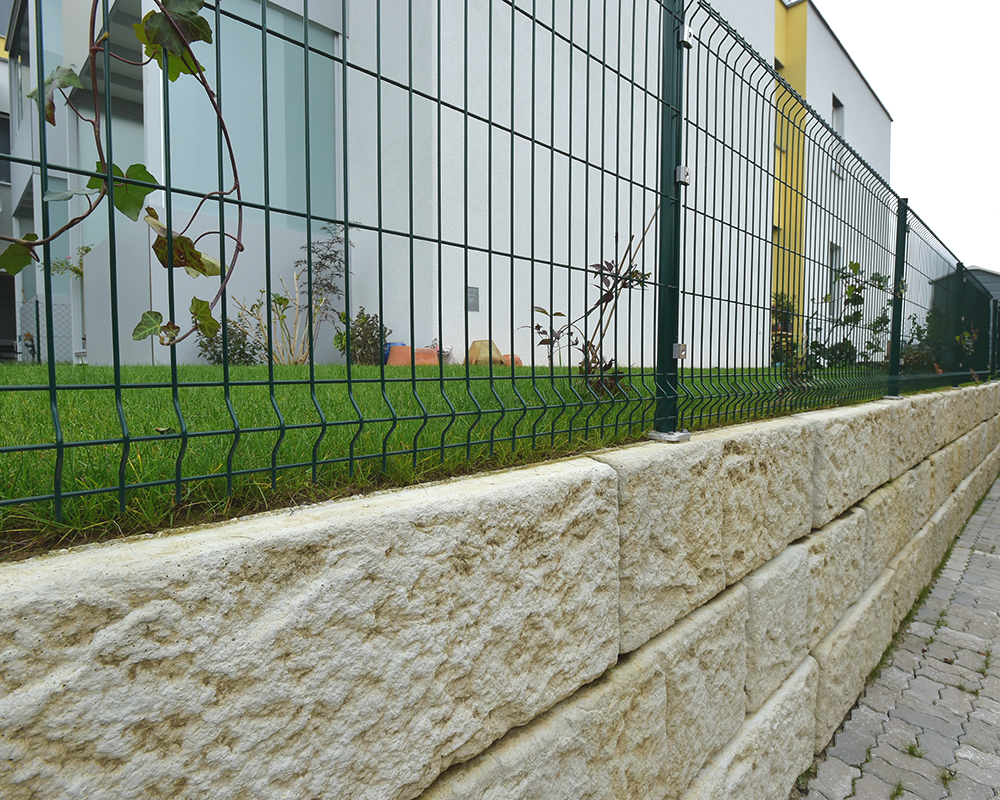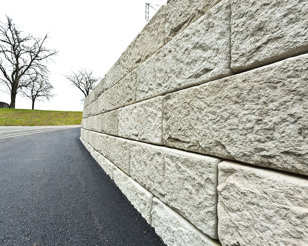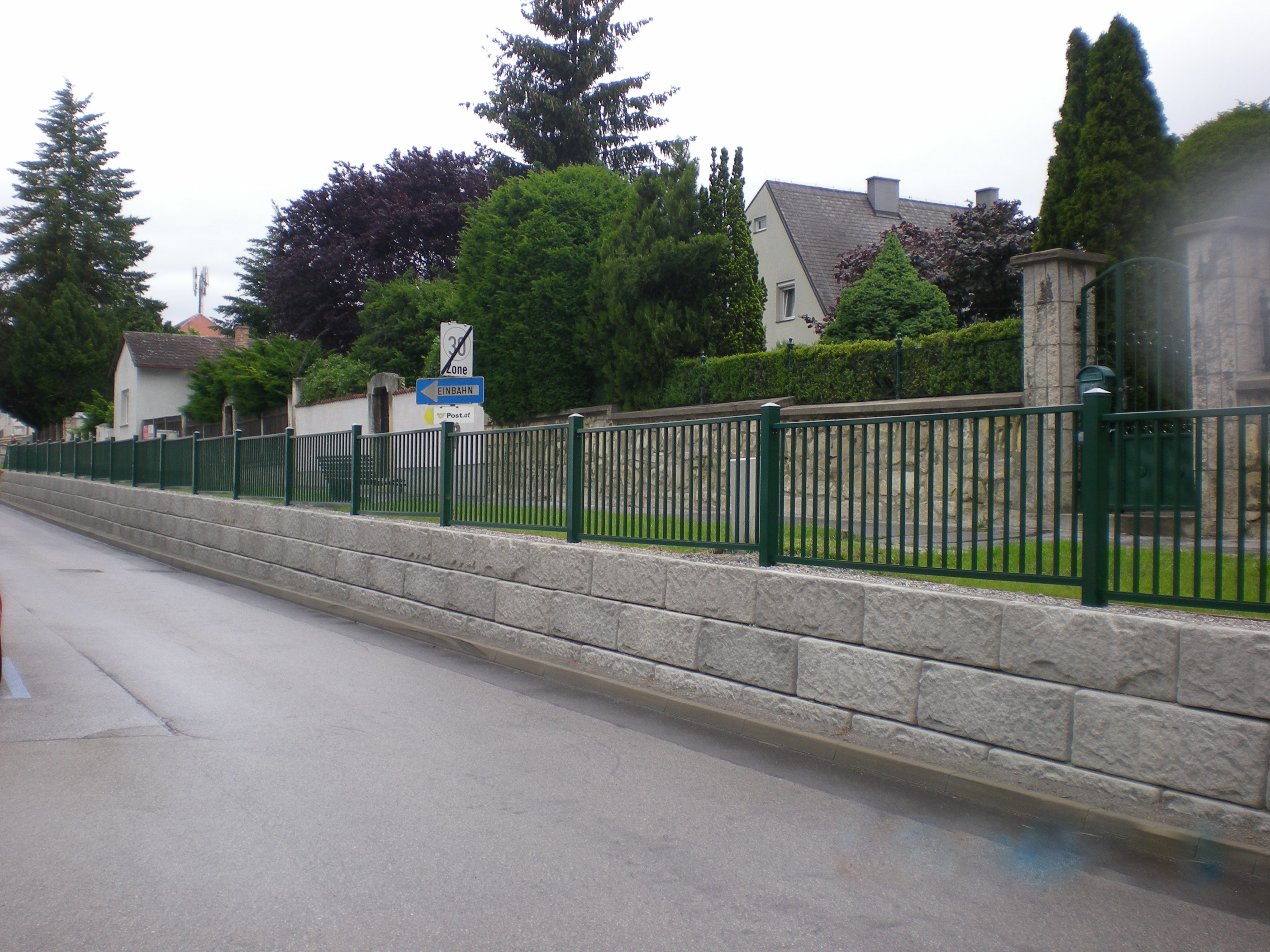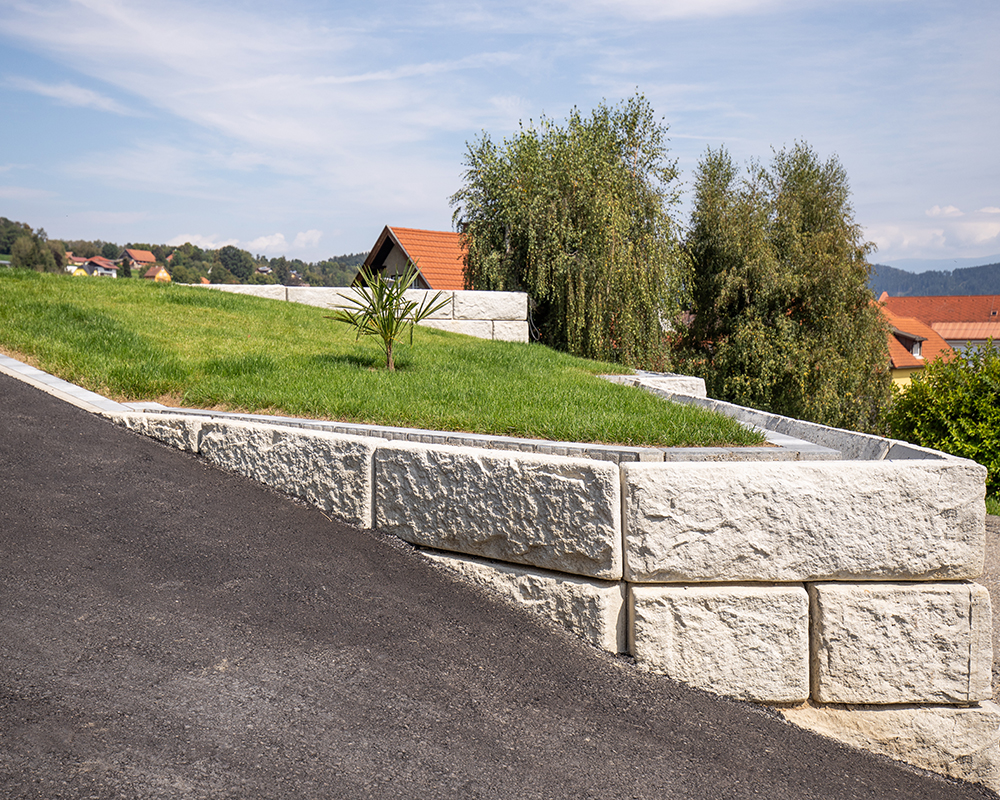 Optisch eine massive Granitblockmauer, technisch ein raffiniertes Stützwandsystem aus Beton - ideal zur Hangsicherung.