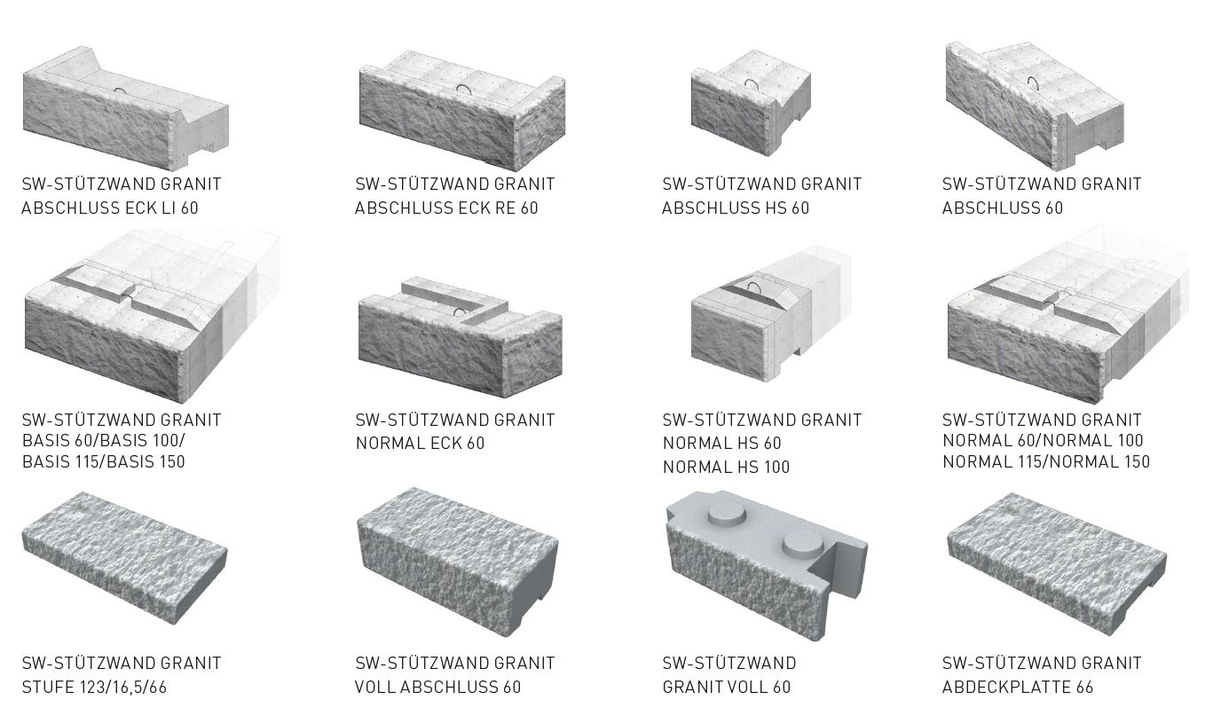 Das SW-Stützwandsystem bildet ein umfassendes und komplettes Paket für ästhetische und funktionelle Stützmauern. Der Aufbau einer Stützwand erfolgt nach dem Baukastenprinzip.
