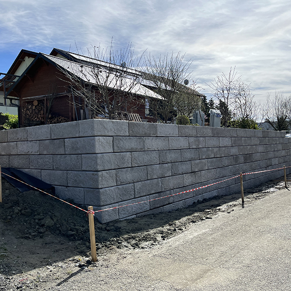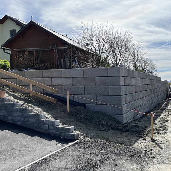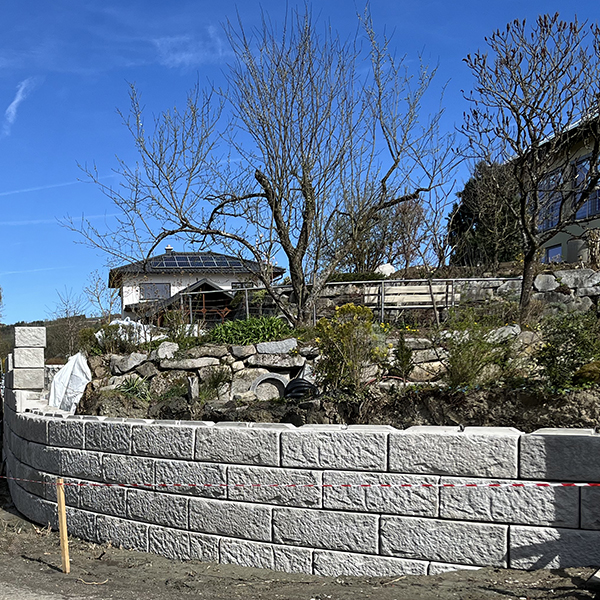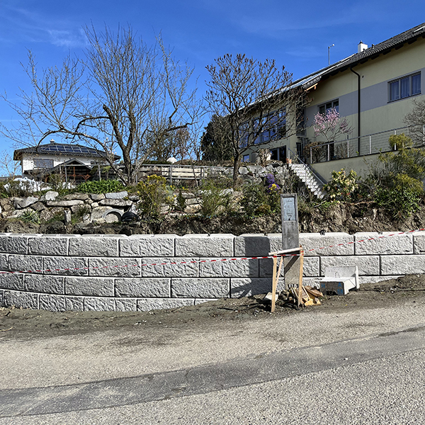 Errichtung einer 2,8 m hohen Stützwand als Abstützung des Gartens eines Familienhauses in Walding, mit einer Außenecke und einer Rundung am Mauerende. Zusätzlich wird für die Gartenbewässerung eine 2-Becken Betonzisterne mit je 15m³ Inhalt eingebaut.