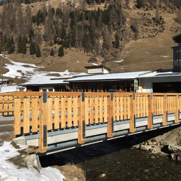 Bei der Brücke in der Gemeinde Innervillgraten im Bezirk Lienz wurde das desolate Stahl-Holztragwerk durch eine dauerhafte und wartungsarme Stahlbeton-Fertigteilbrücke ersetzt. Die vier Fertigteilelemente wurden auf die bestehenden Widerlager mittels Autokran versetzt. Das Holzgeländer konnte an den von uns vorgesehen Gewindeankern, ohne aufwendige Bohrarbeiten, direkt auf die beiden Außenträger montiert werden. Die Tragwerksabmessungen betragen: Länge: 13,65 m, Breite: 4,80 m. Die Tragfähigkeit der Brücke beträgt 44 Tonnen.