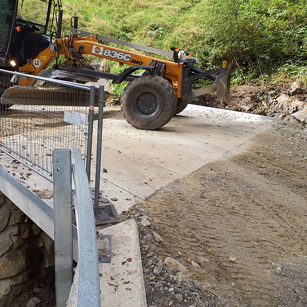Die Brücke befindet sich in der Gemeinde Hopfgarten in Defereggen. Die Fertigteil-Brückenplatten wurden auf die bestehenden Widerlager mittels Autokran versetzt. Unsere Brückentragwerke aus Betonfertigteilen ermöglichen sehr kurze Bauzeiten. Die Tragwerksabmessungen betragen: Länge: 3,45 m, Breite 7,00 m. Die Tragfähigkeit der Brücke beträgt 44 Tonnen.