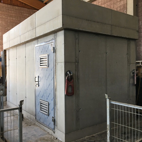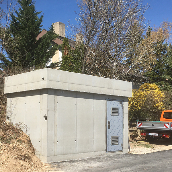 Für eine Drucksteigerungsanlage wurde eine Einhausung in rechteckiger Bauweise inkl. Edelstahleingangstür und Abdeckplatte mit Attika produziert.