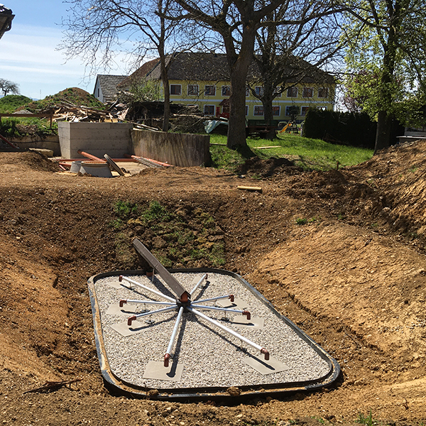 In Haag wurde ein alter Bauernhof umgebaut. Für die Entwässerung der häuslichen Abwässer wurde eine Kleinkläranlage der Type SW-SBR-Kläranlage Biokat mit Bodenfilter (Planzenfilter) und Kontrollschacht eingebaut.