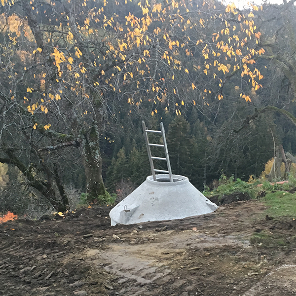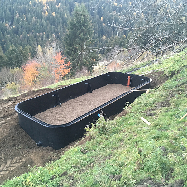 Bei einem abgelegenen Bauernhof oberhalb von Brückl musste, da kein Kanalanschluss vorhanden ist, eine eigene Kleinkläranlage eingebaut werden. Da der Bauherr nicht immer anwesend ist, wurde hier eine stromlose Anlage eingebaut, die aufgrund des Geländes als Pflanzenkläranlage ausgeführt wurde.
