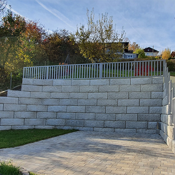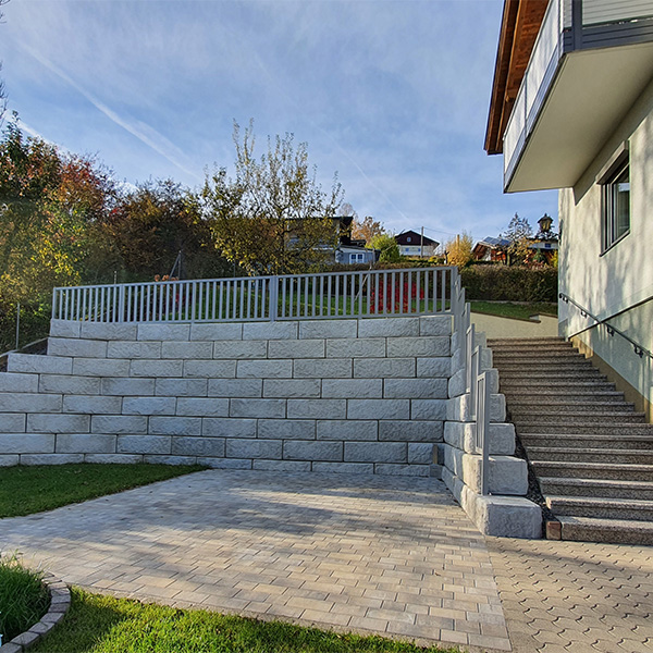 Das SW-Stützwandsystem wurde hier zur bestmöglichen Platzgewinnung und Erweiterung des Einfahrtsbereiches inkl. einem integrierten Treppenaufgang eingesetzt.