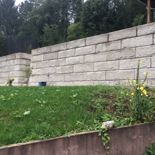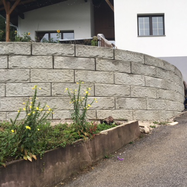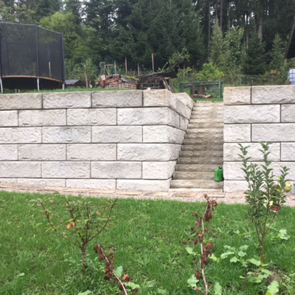 Auf einem abschüssigen Grundstück wurde zur Begradigung eine SW-Stützwand mit einem Außenbogen errichtet. Die Wand ist an der höchsten Stelle 6 Reihen hoch und passt sich verlaufend an die Grundstücksbegebenheiten an. Zusätzlich wurde mit Stufenplatten eine Verbindung vom oberen zum unteren Gartenbereich geschaffen.