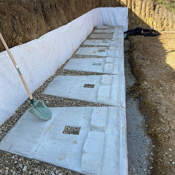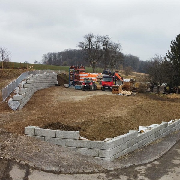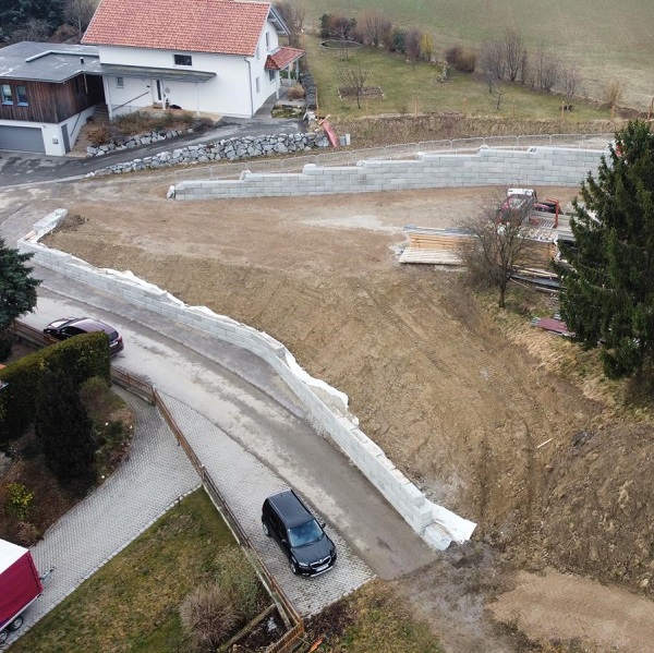 Bei einer Familie in Kirchstetten wurden zwei abgestufte Stützwände als Grundstückseingrenzung und Hangschutz errichtet.
