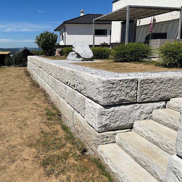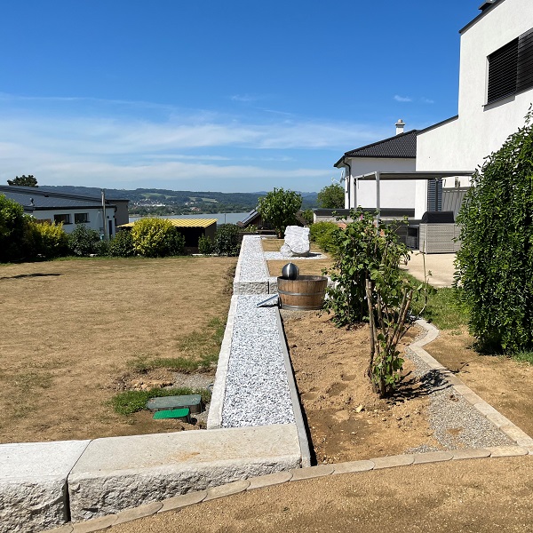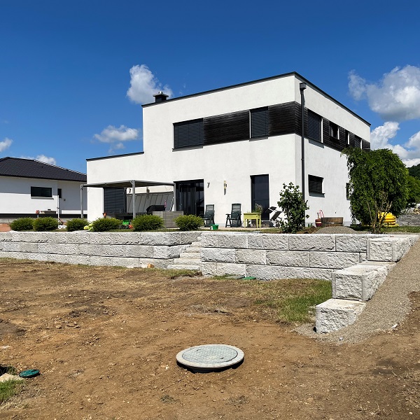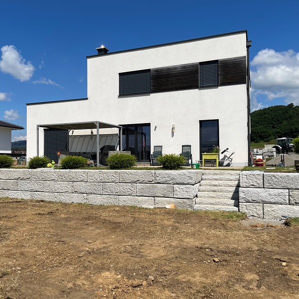 Im Klein-Pöchlarn wurden bei einem Einfamilienhaus verlaufend drei Stützwände errichtet und zusätzlich zwei Stufenaufgänge mit eingebunden. Auf der Vorderseite des Hauses sind vorwiegend Vollblocksteine mit beidseitiger Sicht in Verwendung.