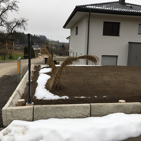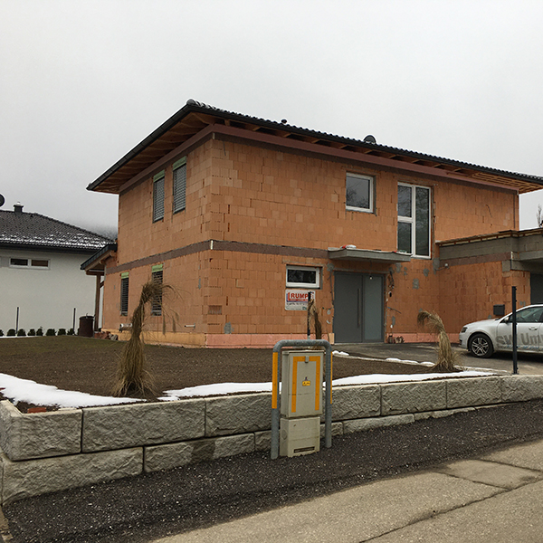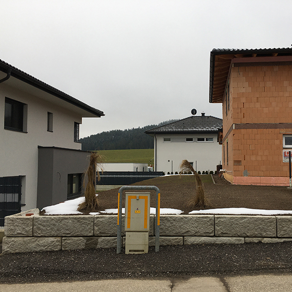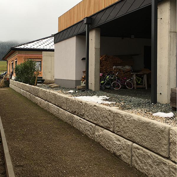 Das SW-Stützwandsystem wurde hier zur Grundstücksabgrenzung und Schaffung einer ebenen Fläche bei einem Privathaus in St. Veit an der Glan errichtet.