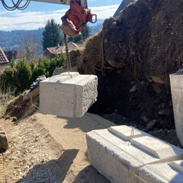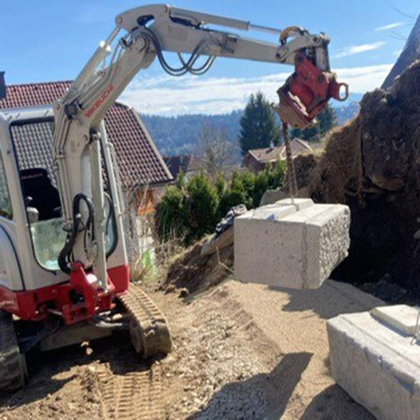 Bei dem Projekt in Moosburg wurde das SW-Stützwandsystem errichtet, um eine Hangstützung auch auf kleinstem Raum zu schaffen und einen optischen Akzent im Garten zu setzen. Die Planung bis hin zur Versetzung der Mauer erfolgte innerhalb nur eines Tages.