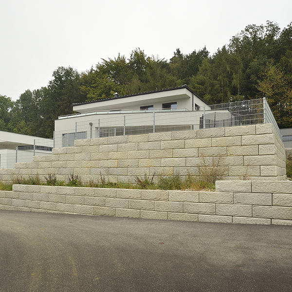 Zur optimalen Nutzung des Grundstückes wurde eine massive Stützwand errichtet. Die Wand hat im Terrassenbereich eine Rundung und einen integrierten Stiegenaufgang – zur Straßenseite hin wurde die bis zu 4 m hohe Wand einmal abgesetzt. So sind im vorderen Bereich zwei abgestufte, versetzte Wände errichtet worden. Der Zaun wurde direkt auf die Abschlusssteine montiert.