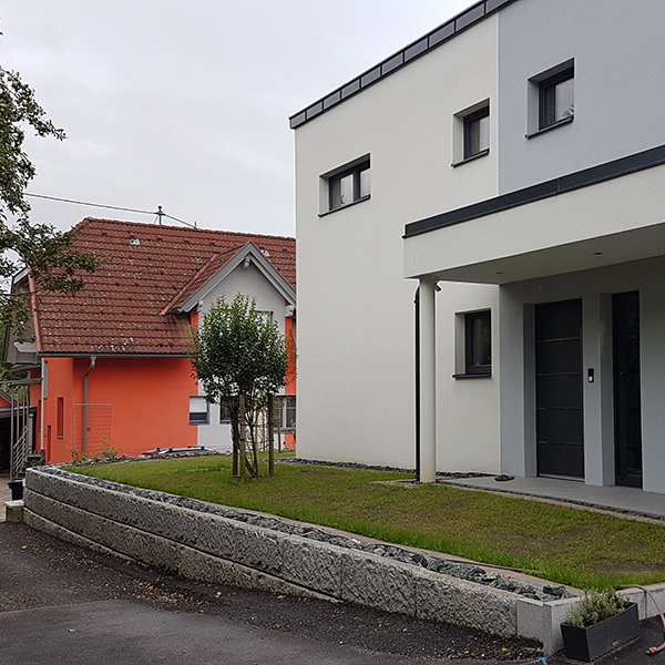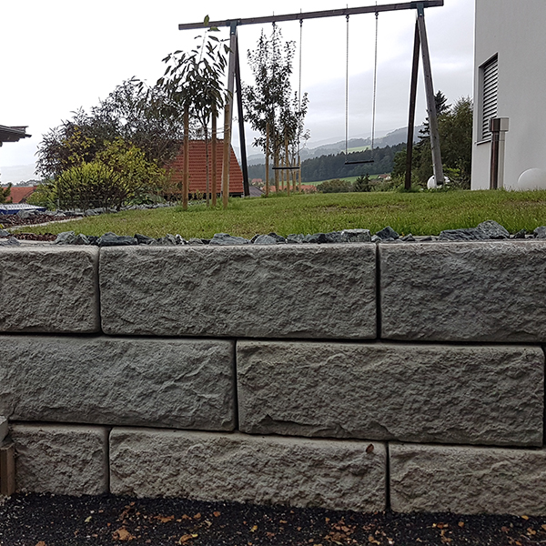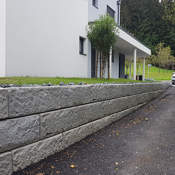 Rund um ein Einfamilienhaus konnte mit dem SW-Stützwandsystem ein Höhenausgleich geschaffen werden. Die Eckverbindungen wurden mit SW-Passsteinen errichtet, die eine spezielle Form haben und somit bauseits leichter an den gewünschten Eckwinkel angepasst werden können.